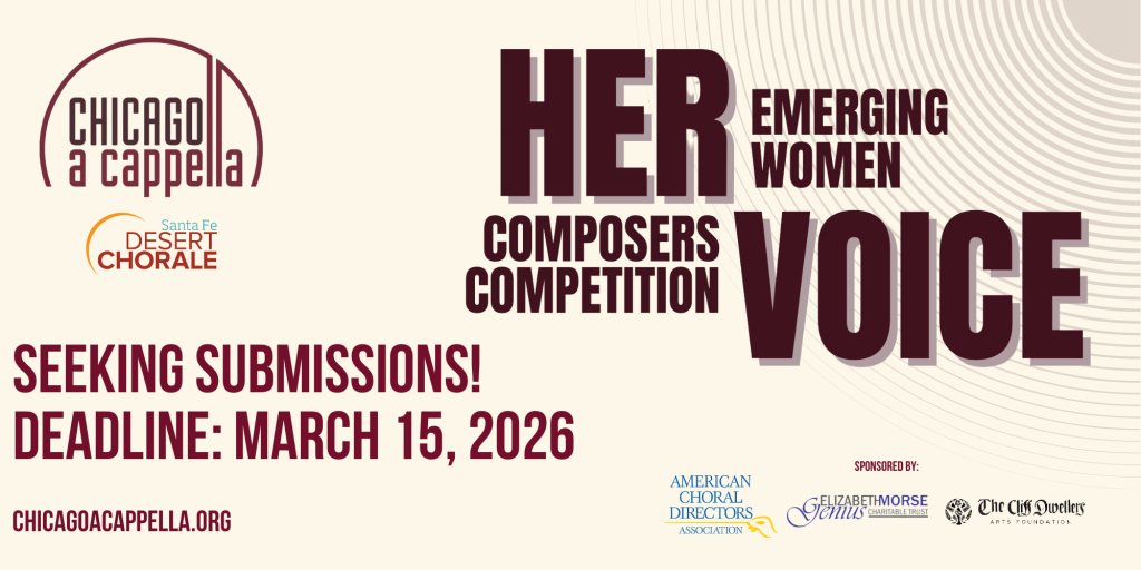 Chicago a cappella seeks submissions for HerVoice, a competition and mentorship program for women composers. A partnership the Santa Fe Desert Chorale, this opportunity is open to composers of all ages who self-identify as female, from anywhere in the world. It is intended to promote the work of promising composers and provide hands-on training to further their skills in choral composition. We are seeking composers who are eager to improve their skill at choral composition. Women composers whose career is in its early stages and women composers of color are particularly encouraged to apply.